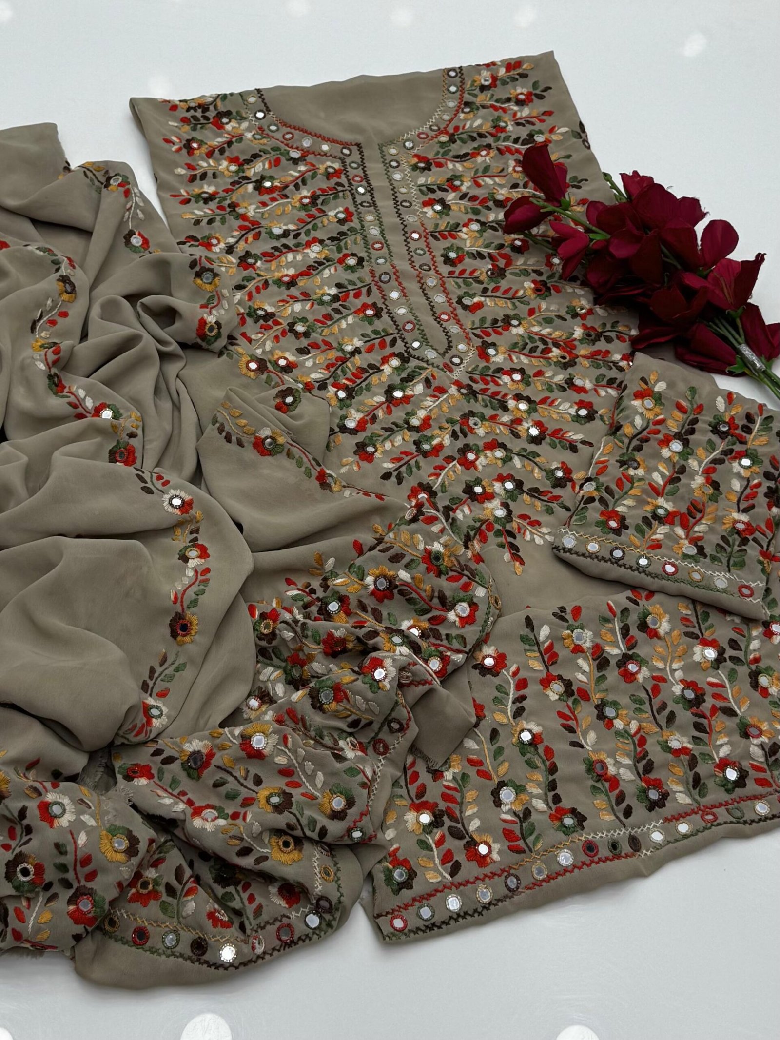 Upgrade your wardrobe with this graceful brown embroidered 3-piece chiffon dress, designed for women who love traditional style with a modern touch.