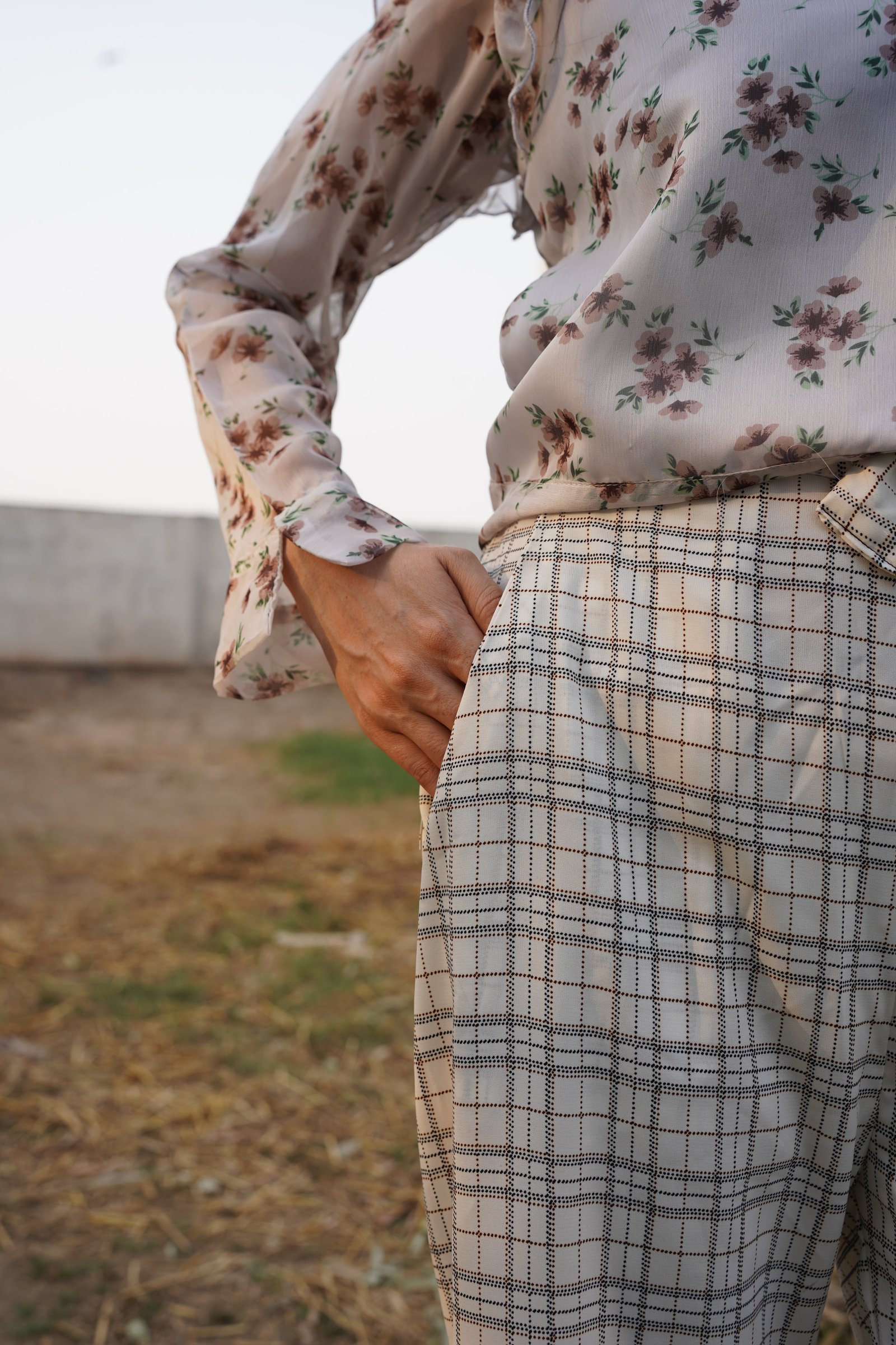 Chiffon Floral Top & Georgette Plaid Wide-Leg Pant Set