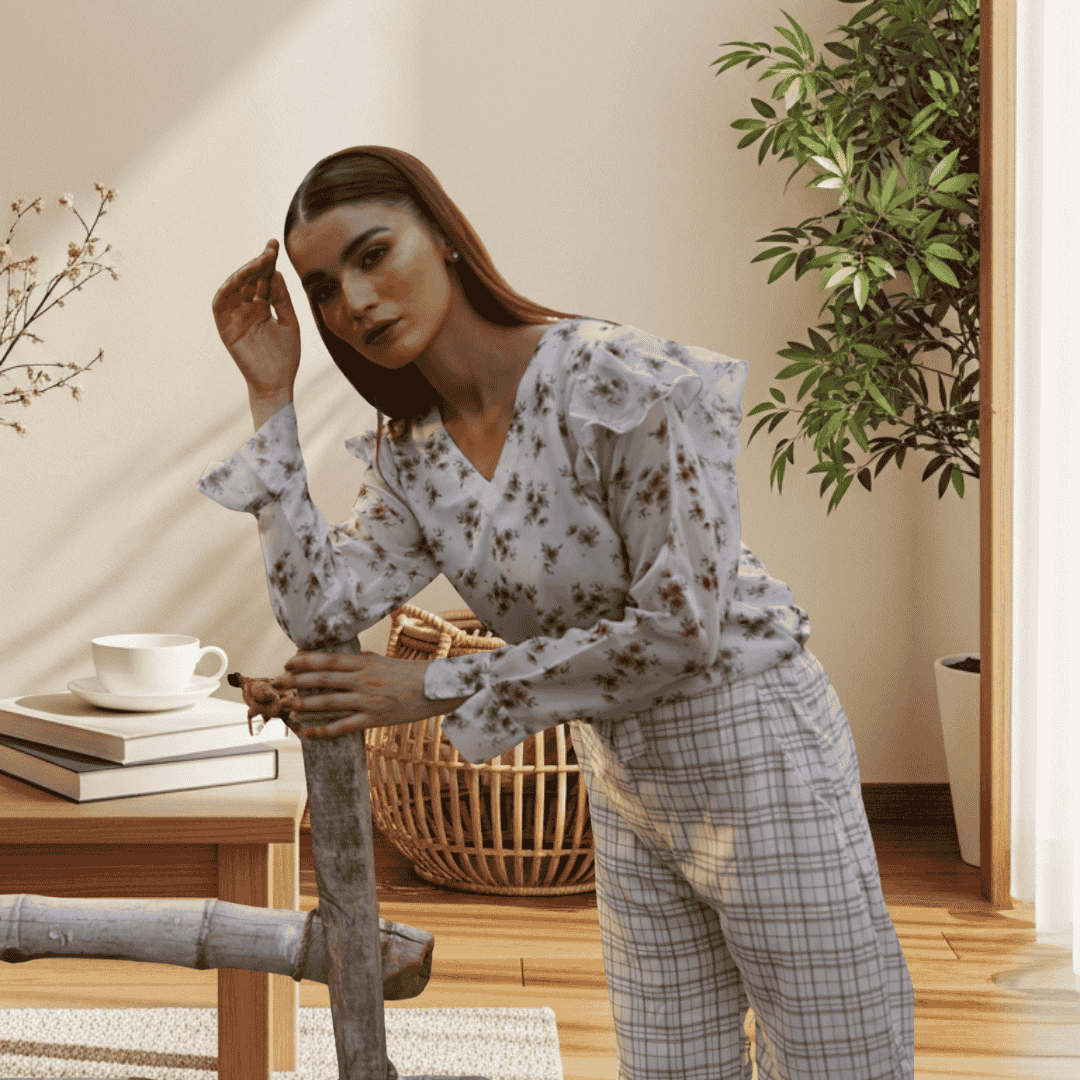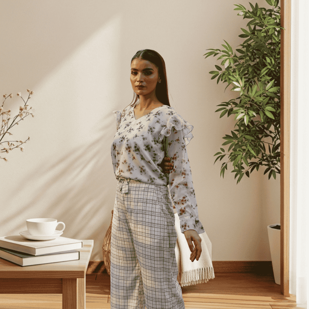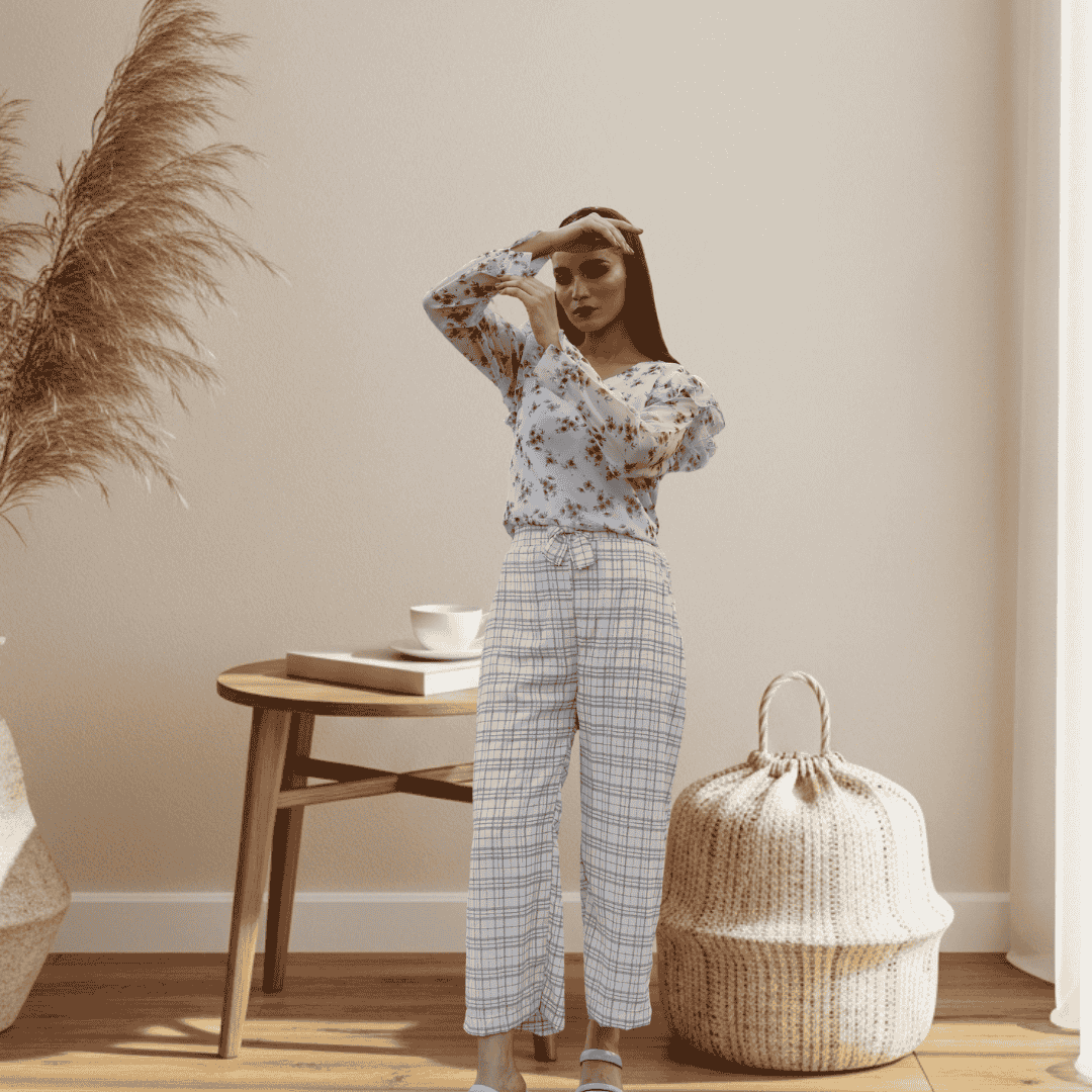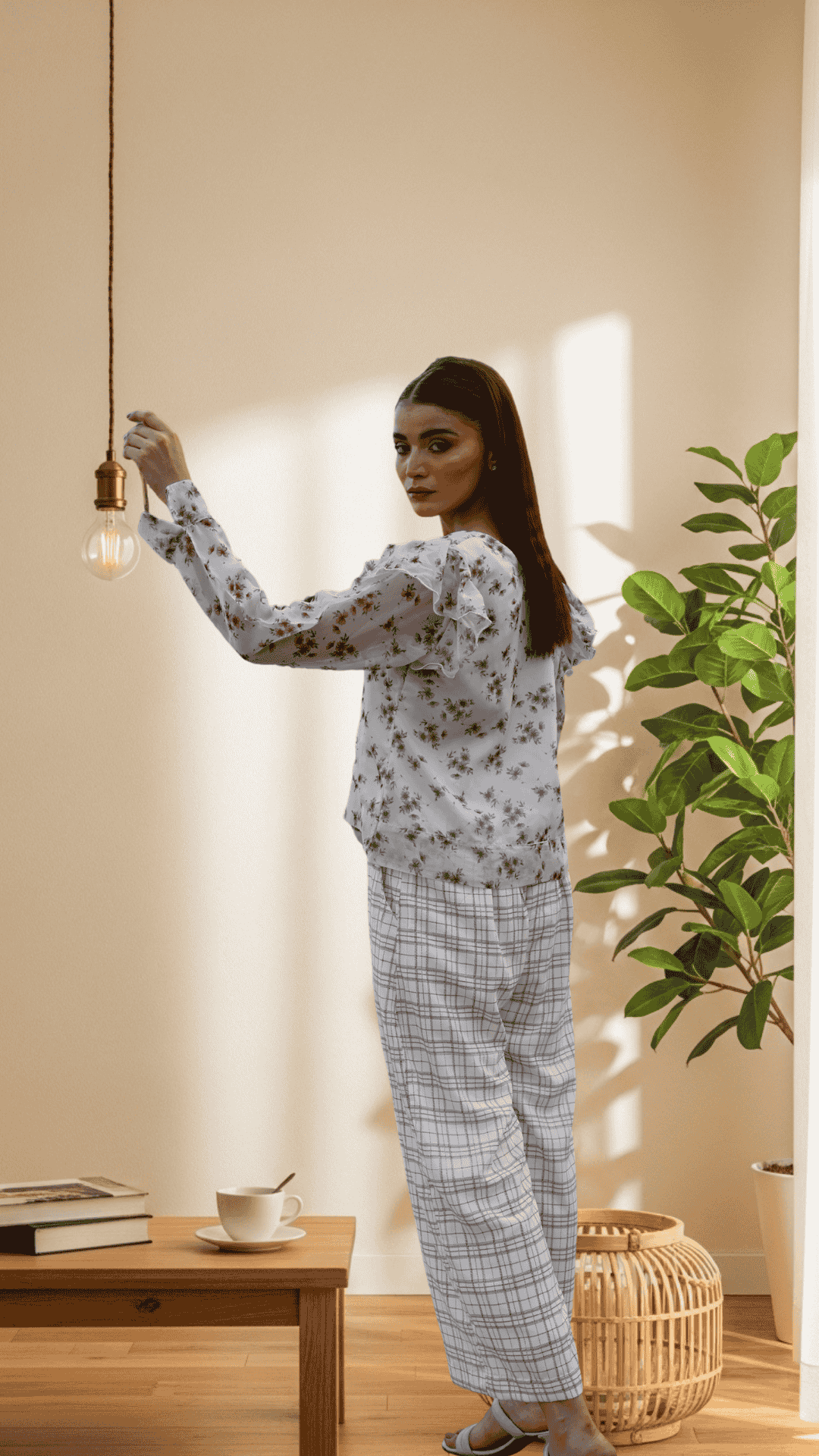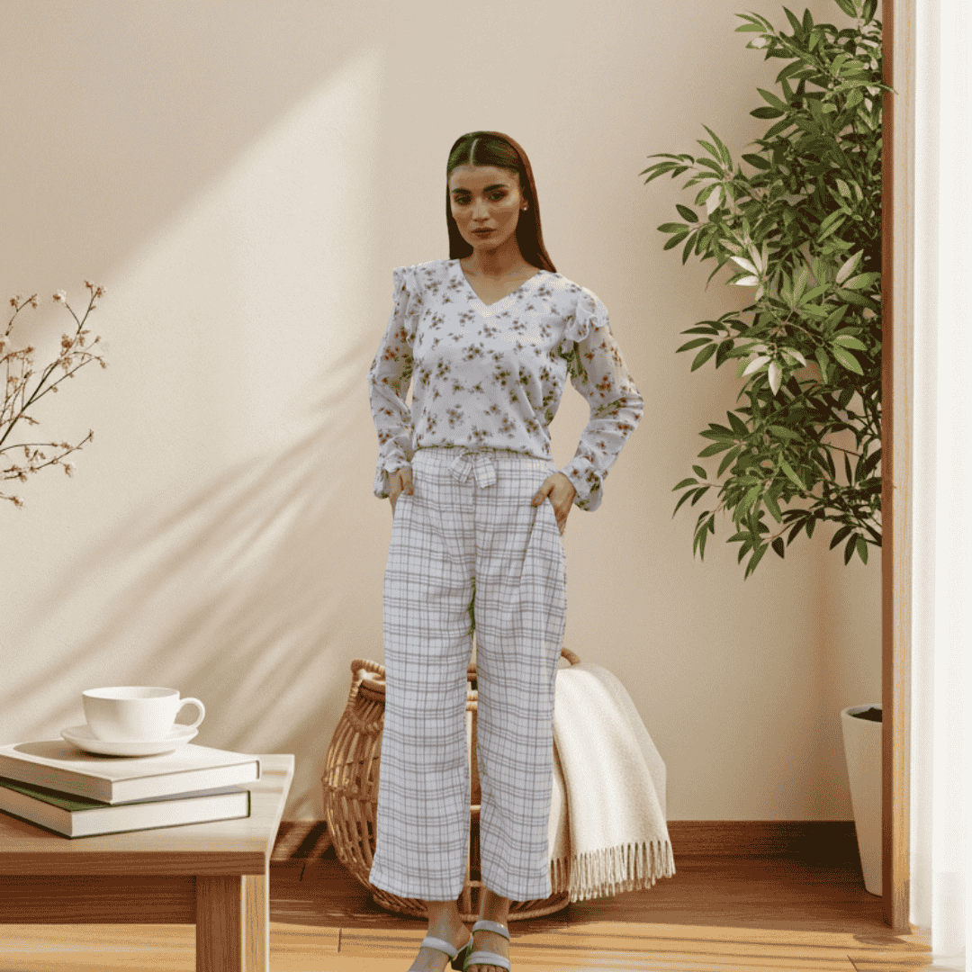1 review for Chiffon Floral Top & Georgette Plaid Wide-Leg Pant Set