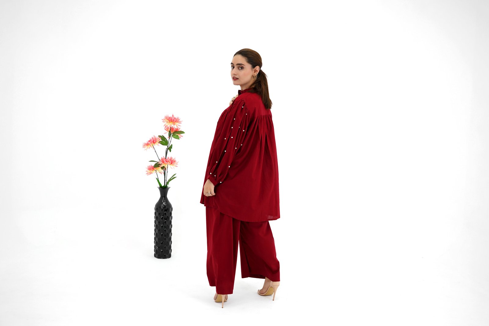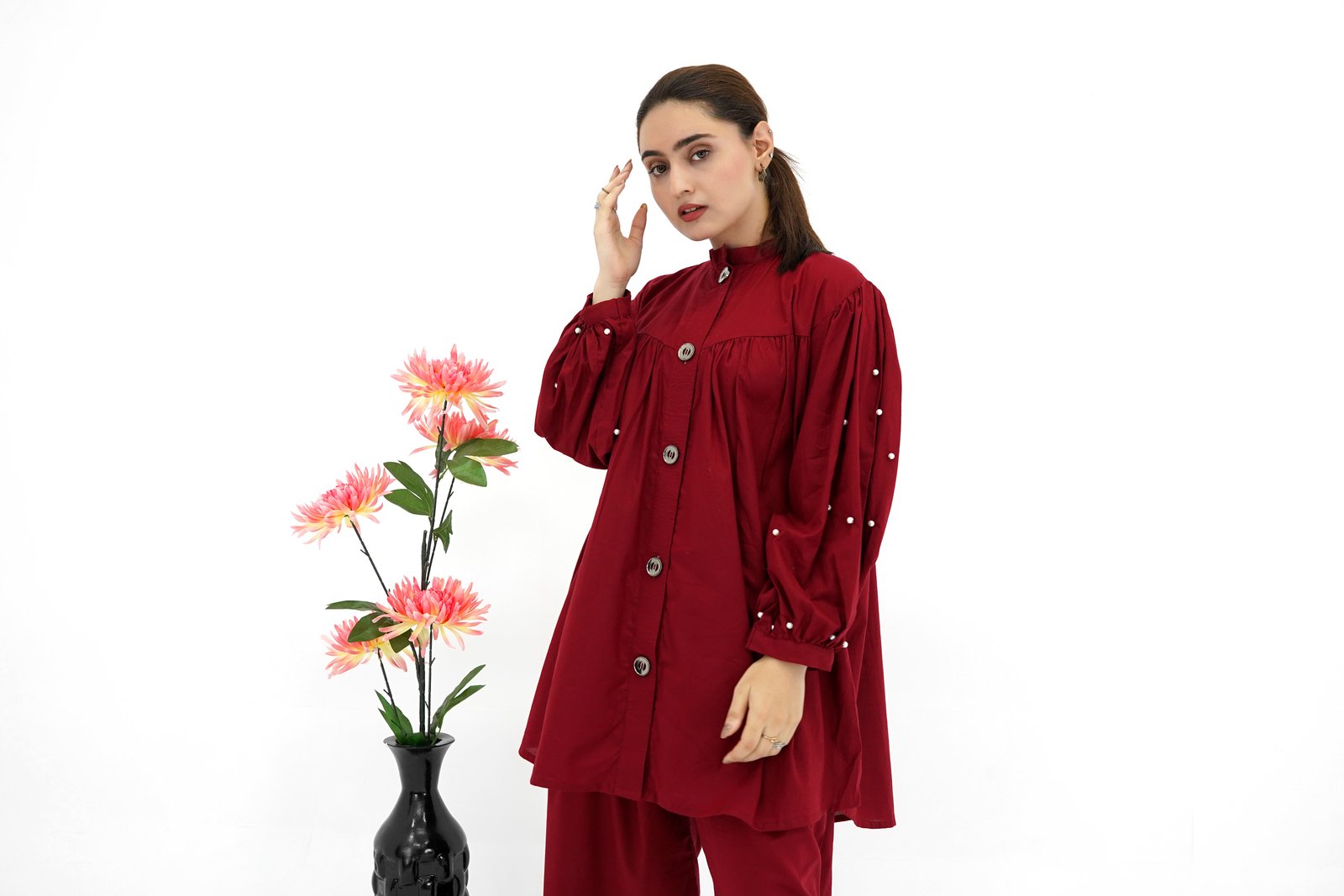 Step out in style with this maroon button-down tunic paired with straight trousers. Designed for comfort and elegance, the tunic features delicate pearl embellishments. Ideal for both casual and semi-formal occasions, this set is your go-to for a chic look.