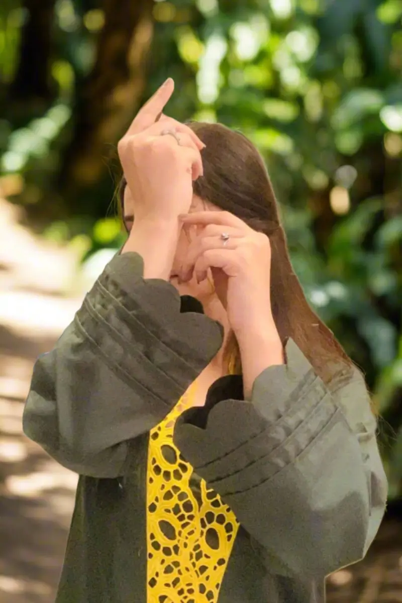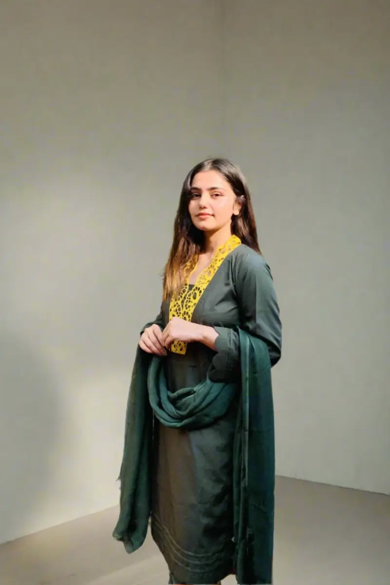 The kameez features a beautiful V-shaped neckline with vibrant yellow embroidery and cutwork, giving it a polished look. It’s paired with matching olive-green trousers with scalloped hems and a lightweight, premium-quality chiffon dupatta, making this 3-piece suit (kameez, trousers, chiffon dupatta) a complete package.