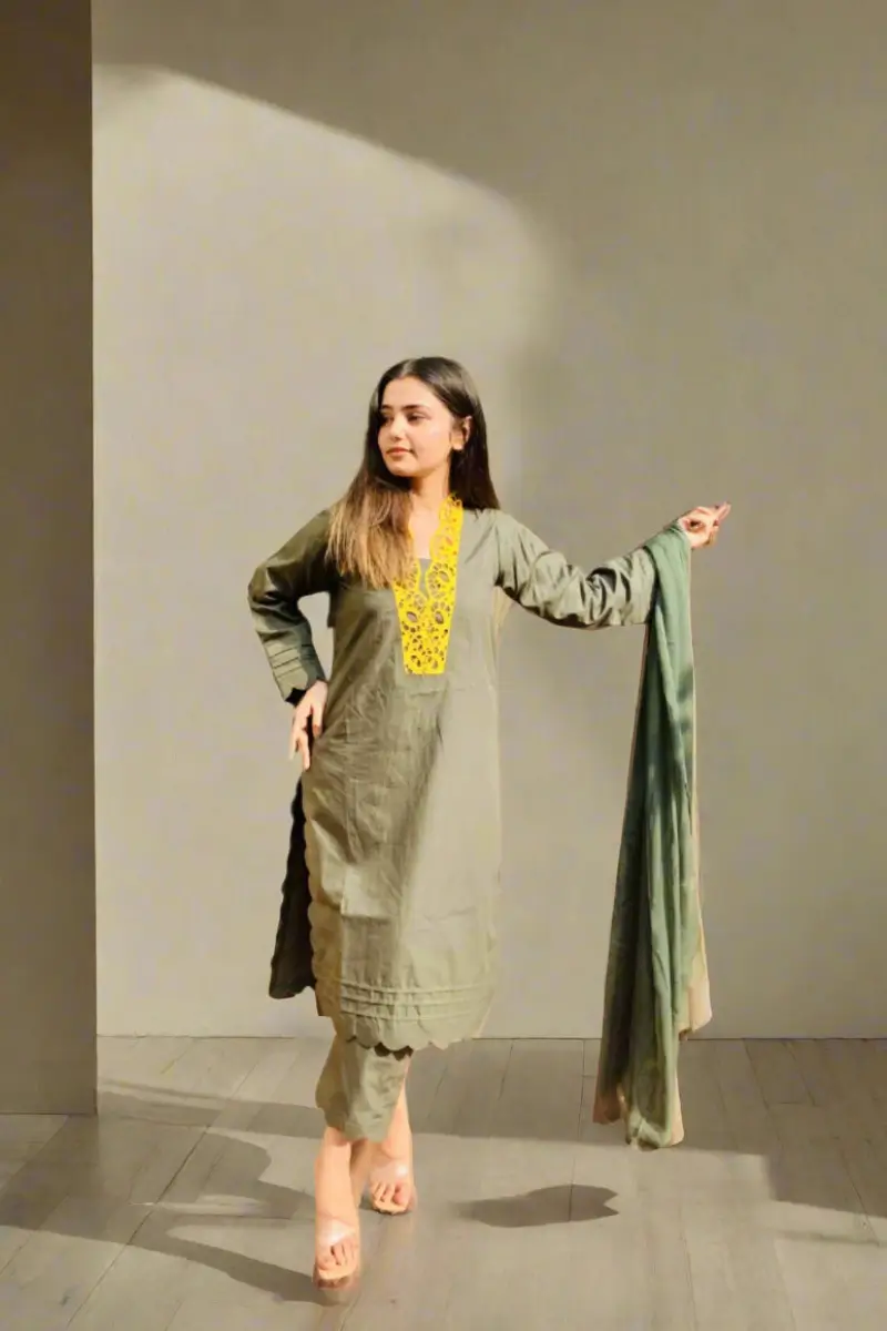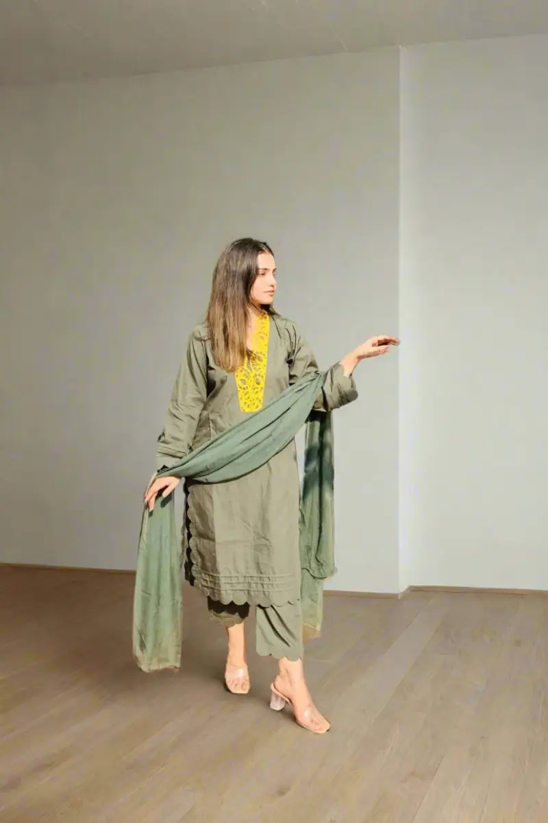 Olive Green 3 Piece Cotton Suit with Yellow Embroidered Neckline & Scalloped Hem
